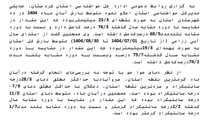 بررسی وضعیت بارش و دما ایستگاه های هواشناسی استان کردستان درآبان ماه 1404