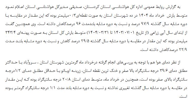 بررسی وضعیت بارش و دما ایستگاه های هواشناسی استان کردستان درخرداد ماه 1404