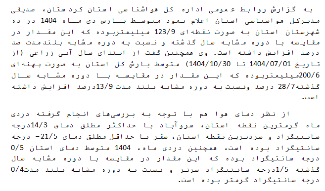 بررسی وضعیت بارش و دما ایستگاه های هواشناسی استان کردستان در دی ماه 1404