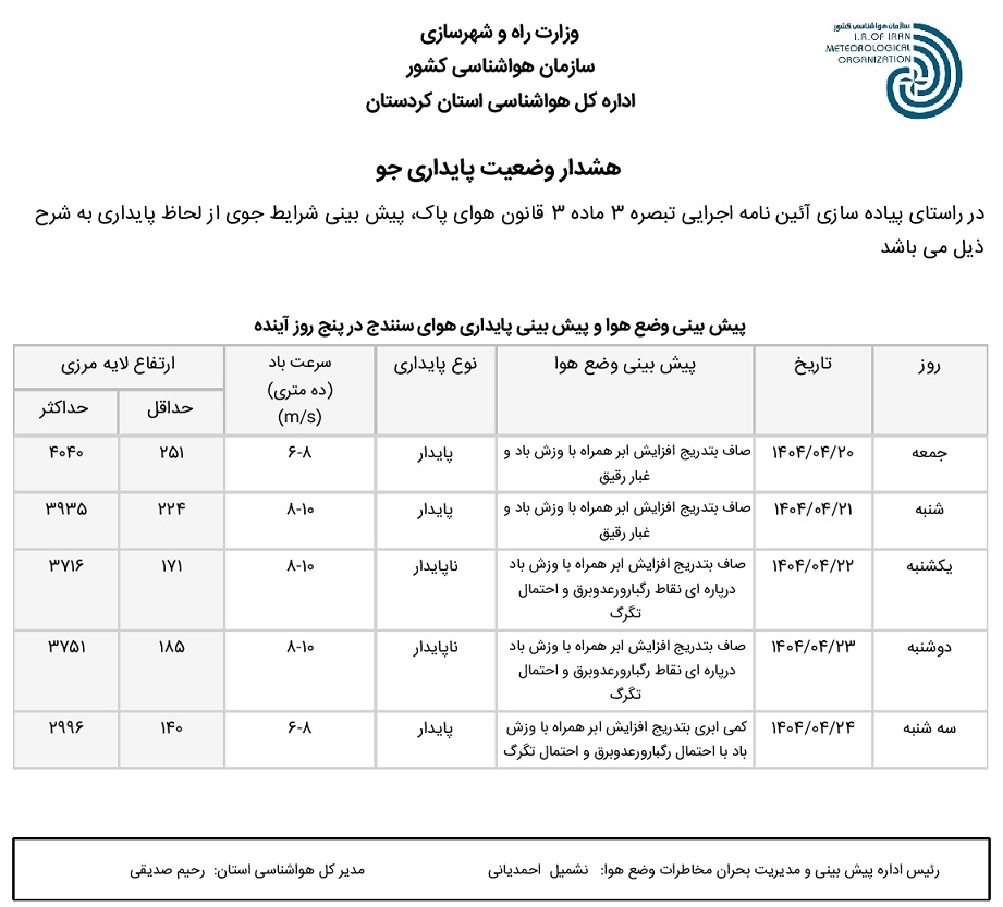 بولتن آلودگی استان کردستان؛ تاریخ صدور: جمعه 20 تیر ماه 1404