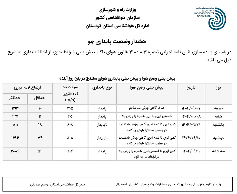 بولتن آلودگی استان کردستان؛ تاریخ صدور : جمعه 7 آذر ماه 1404