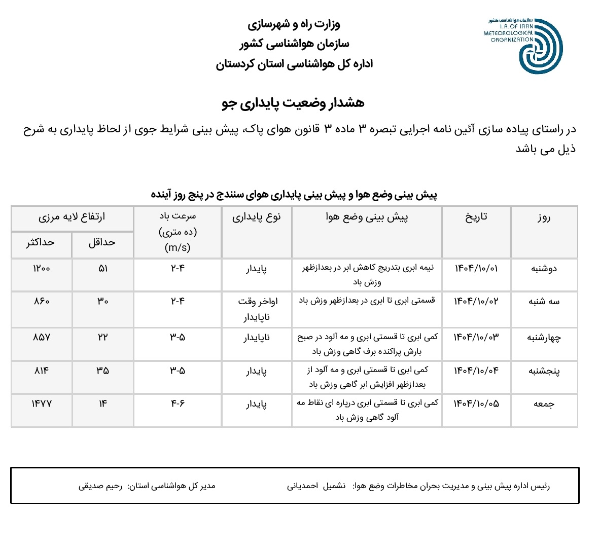 بولتن آلودگی استان کردستان؛ تاریخ صدور :دوشنبه 1 دی ماه 1404
