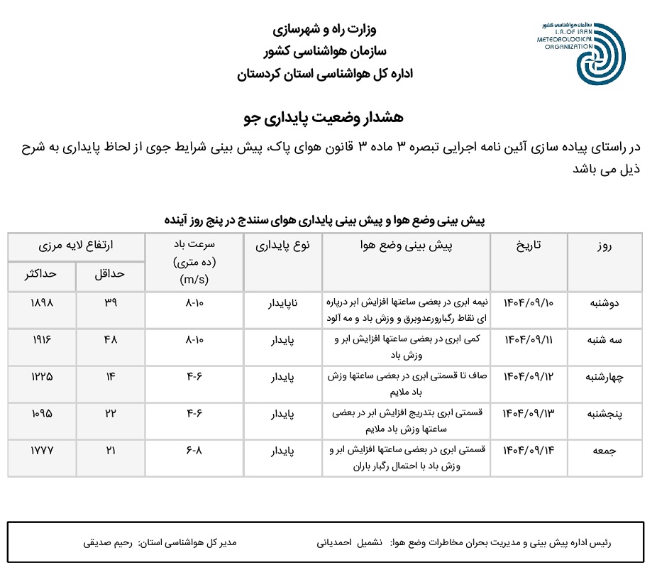 بولتن آلودگی استان کردستان؛ تاریخ صدور : دوشنبه 10 آذر ماه 1404
