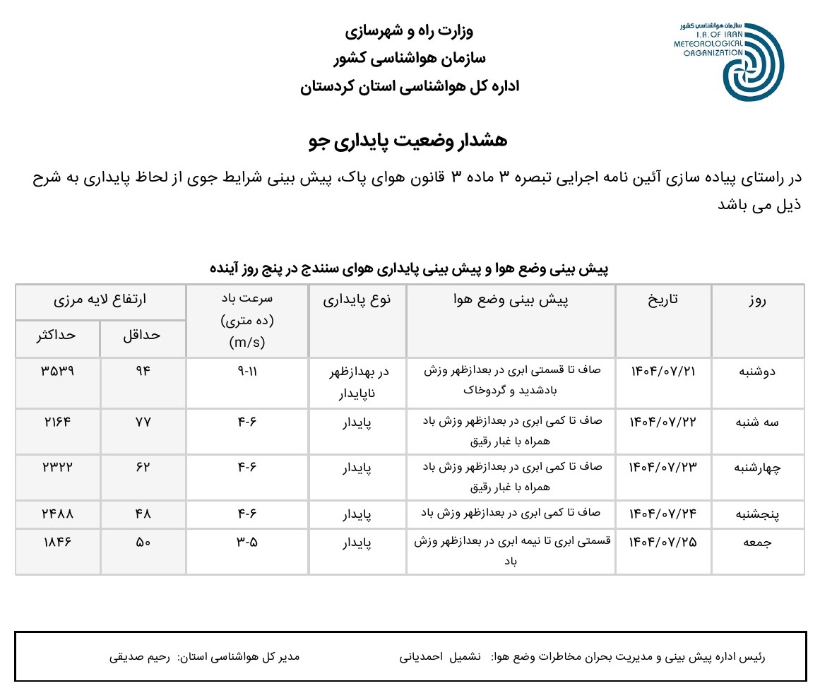 بولتن آلودگی استان کردستان؛ تاریخ صدور : دوشنبه 21 مهر ماه 1404