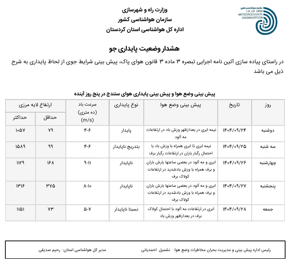 بولتن آلودگی استان کردستان؛ تاریخ صدور : دوشنبه 24 آذر ماه 1404