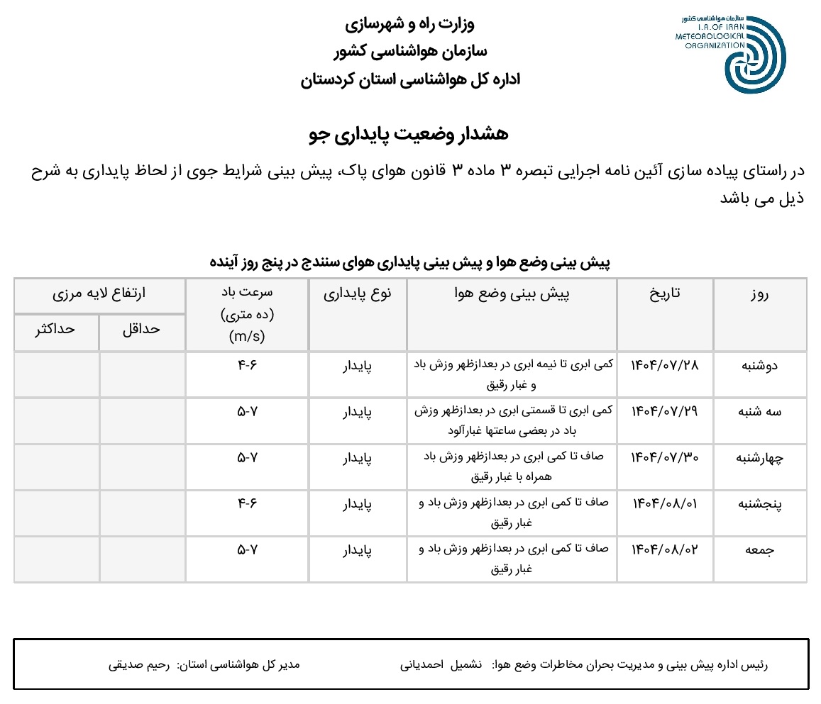 بولتن آلودگی استان کردستان؛ تاریخ صدور : دوشنبه 28 مهر ماه 1404