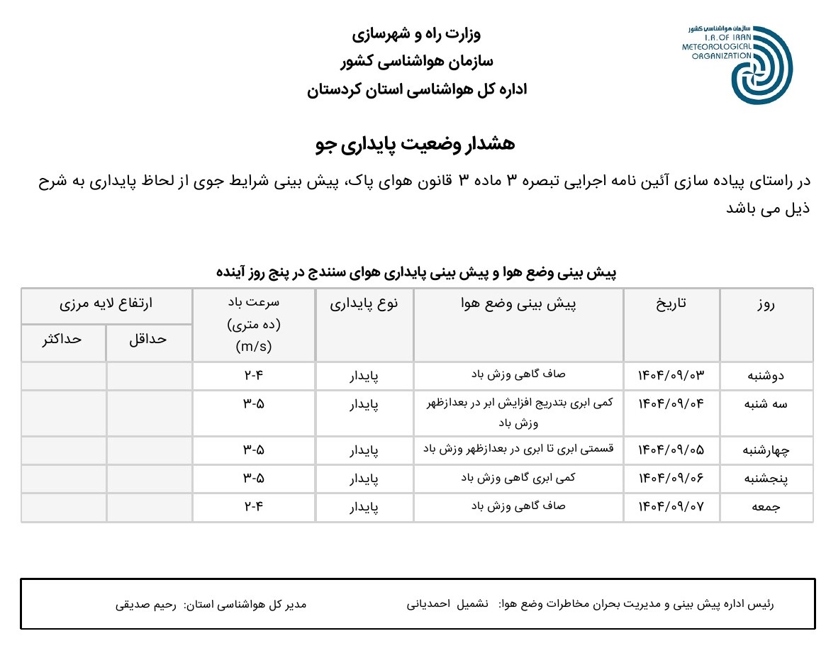 بولتن آلودگی استان کردستان؛ تاریخ صدور : دوشنبه 3 آذر ماه 1404