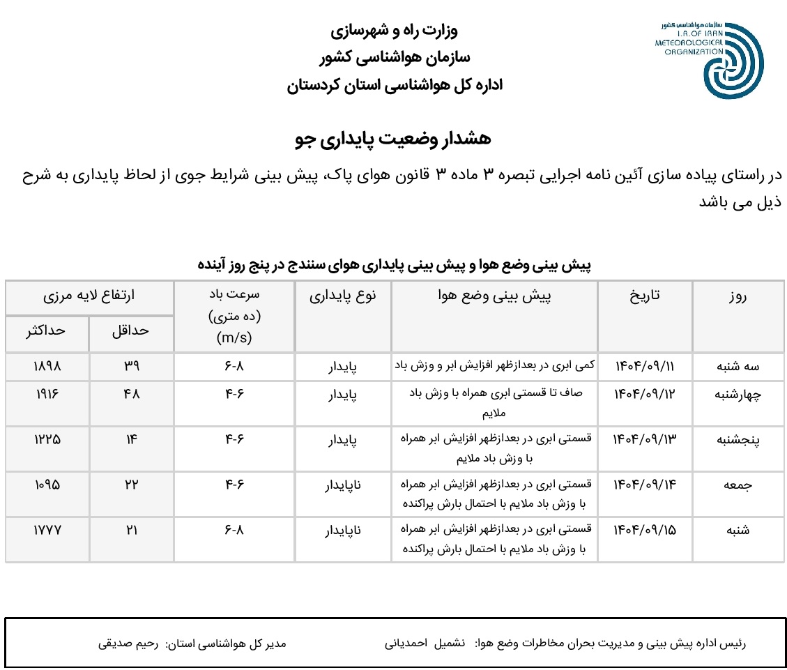 بولتن آلودگی استان کردستان؛ تاریخ صدور : سه شنبه 11 آذر ماه 1404