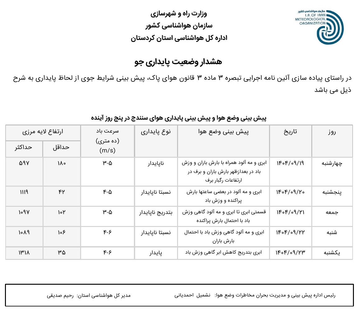 بولتن آلودگی استان کردستان؛ تاریخ صدور : سه شنبه 18 آذر ماه 1404