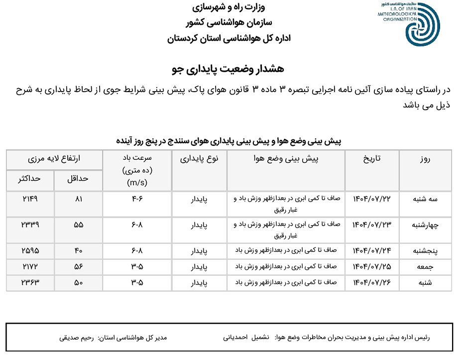 بولتن آلودگی استان کردستان؛ تاریخ صدور : سه شنبه 22 مهر ماه 1404