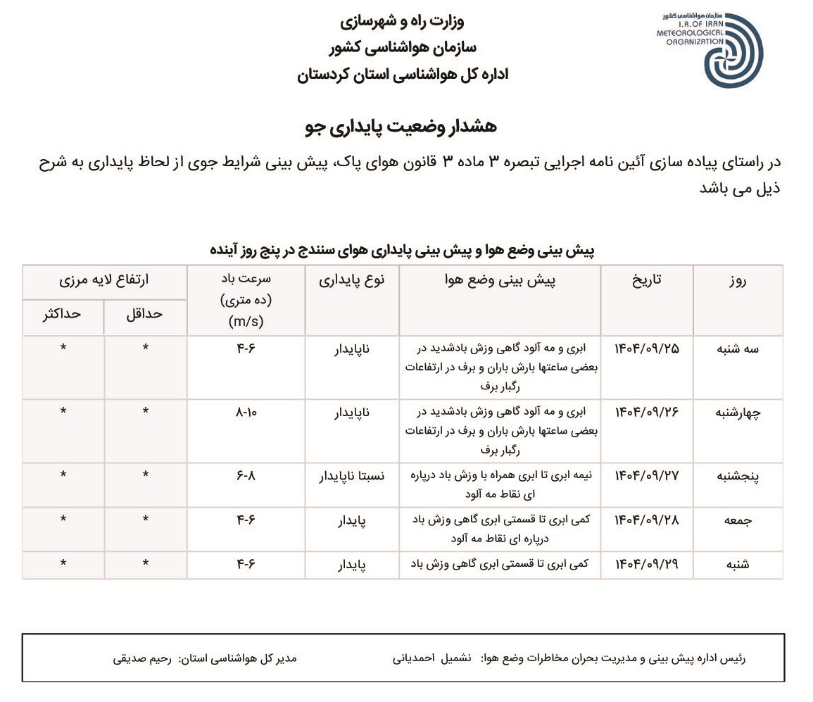 بولتن آلودگی استان کردستان؛ تاریخ صدور : سه شنبه 25 آذر ماه 1404