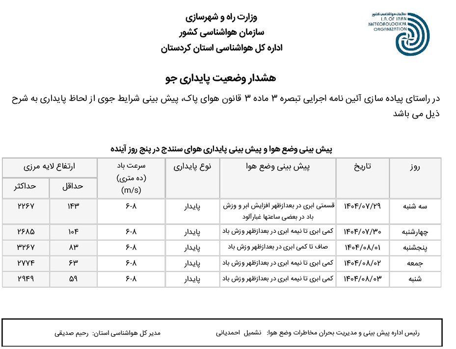 بولتن آلودگی استان کردستان؛ تاریخ صدور : سه شنبه 29 مهر ماه 1404
