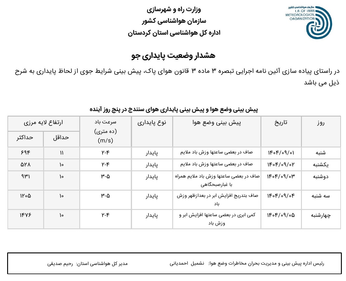 بولتن آلودگی استان کردستان؛ تاریخ صدور :شنبه 1 آذر ماه 1404