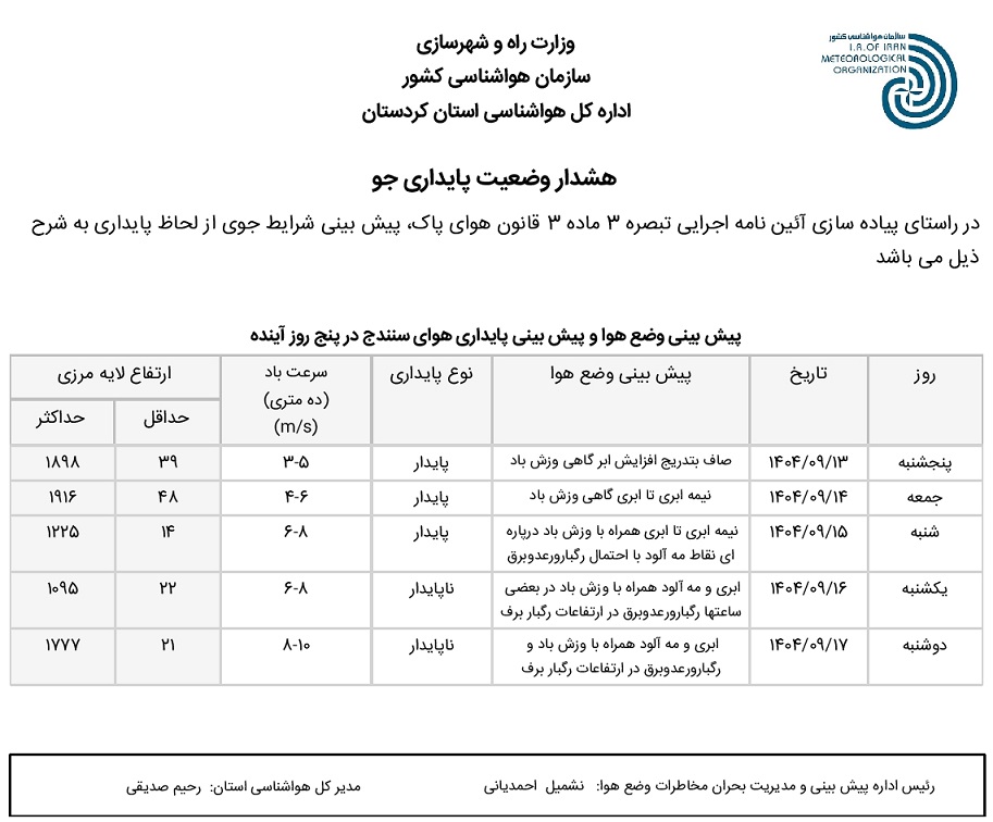 بولتن آلودگی استان کردستان؛ تاریخ صدور : پنجشنبه 13 آذر ماه 1404