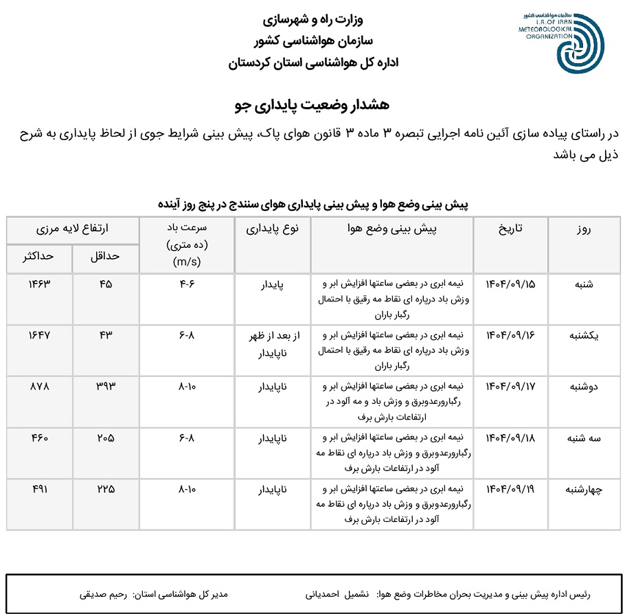 بولتن آلودگی استان کردستان؛ تاریخ صدور : شنبه 15 آذر ماه 1404