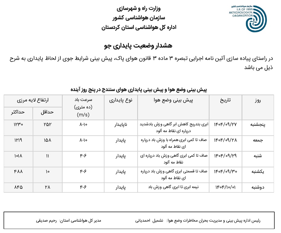 بولتن آلودگی استان کردستان؛ تاریخ صدور : پنجشنبه 27 آذر ماه 1404