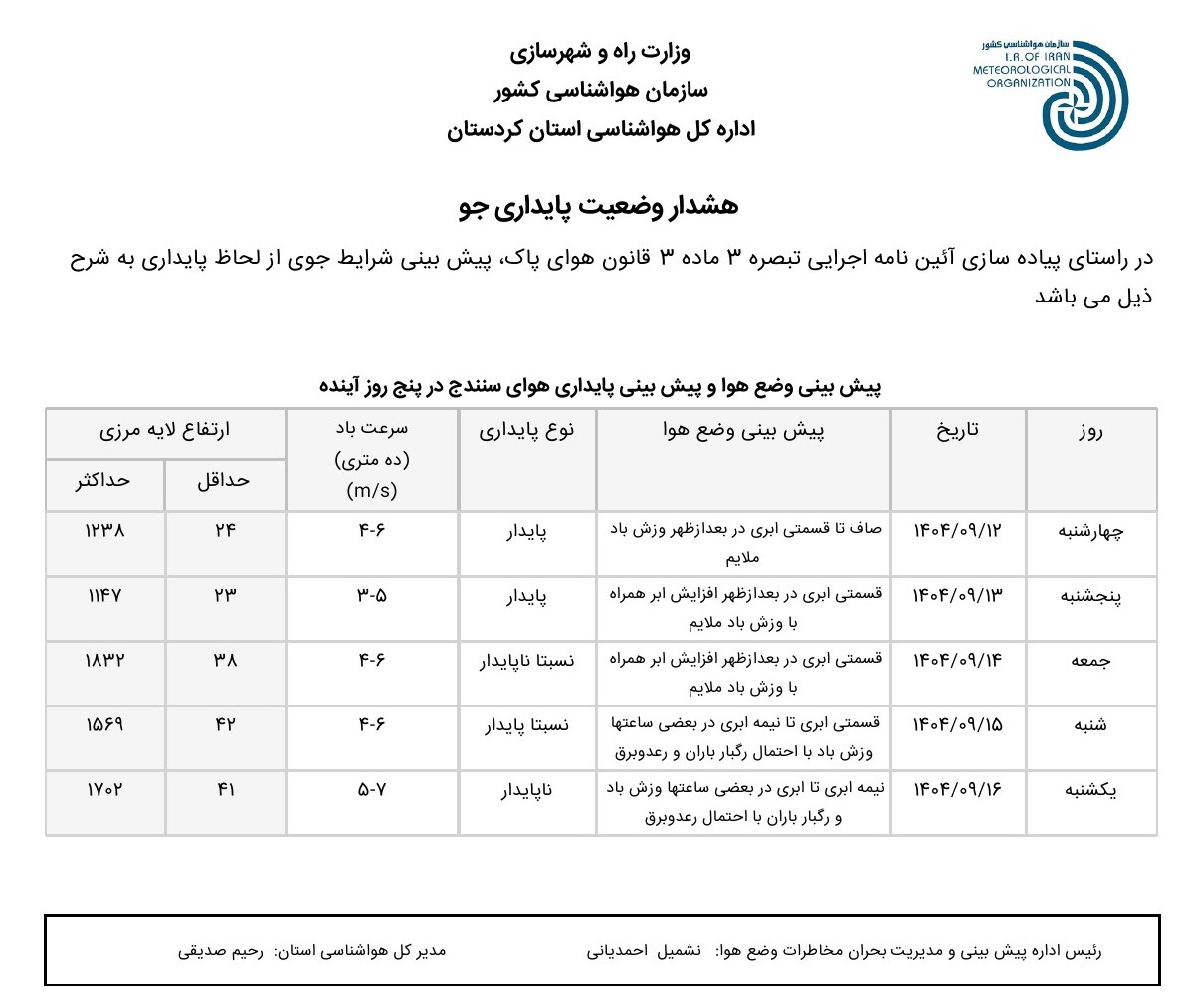 بولتن آلودگی استان کردستان؛ تاریخ صدور : چهارشنبه 12 آذر ماه 1404