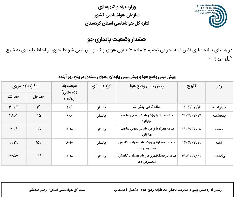 بولتن آلودگی استان کردستان؛ تاریخ صدور : چهارشنبه 16 مهر ماه 1404