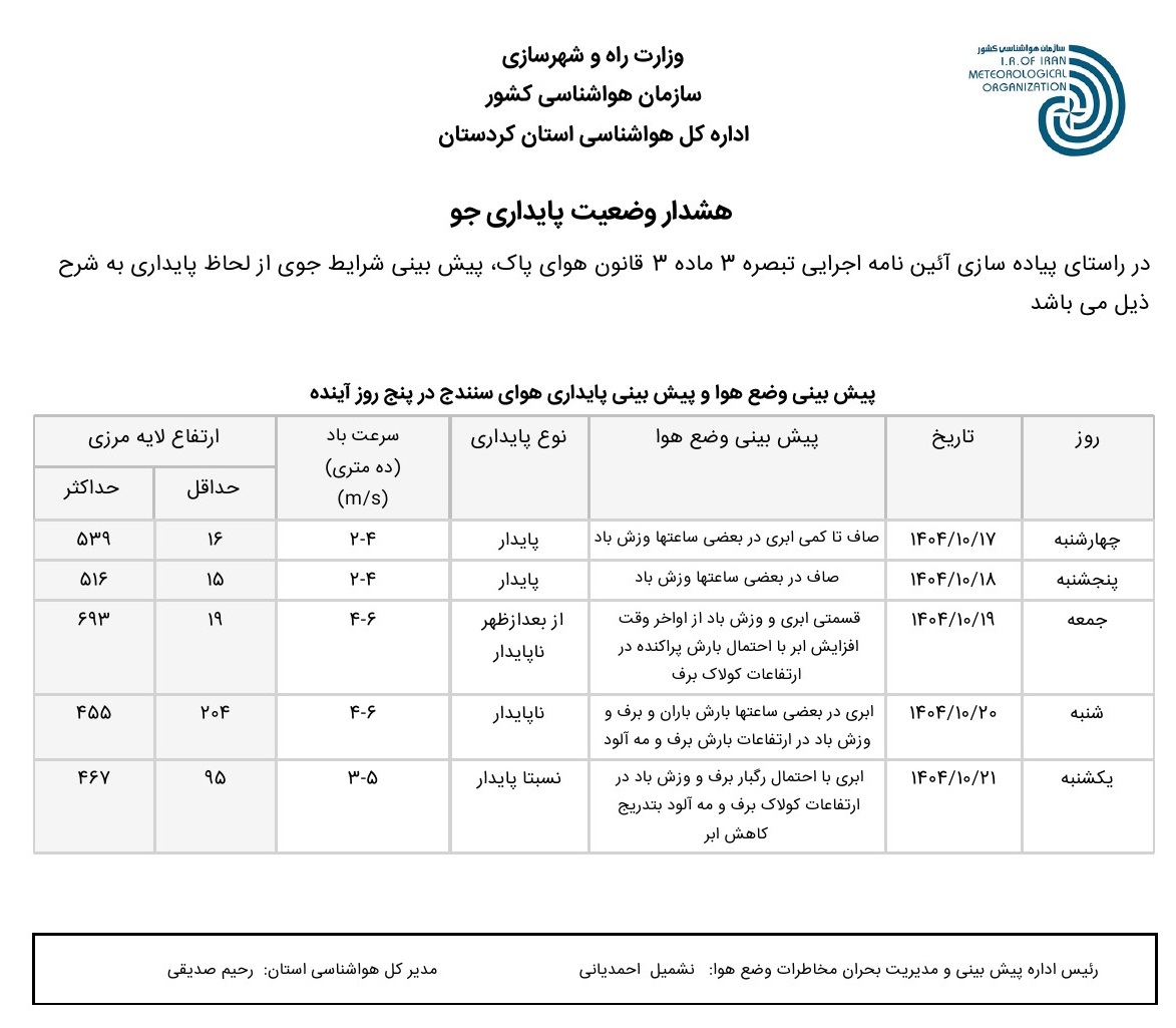 بولتن آلودگی استان کردستان؛ تاریخ صدور : چهارشنبه 17 دی ماه 1404