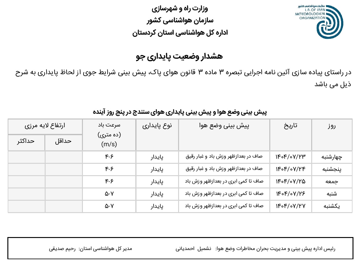 بولتن آلودگی استان کردستان؛ تاریخ صدور : چهارشنبه 23 مهر ماه 1404