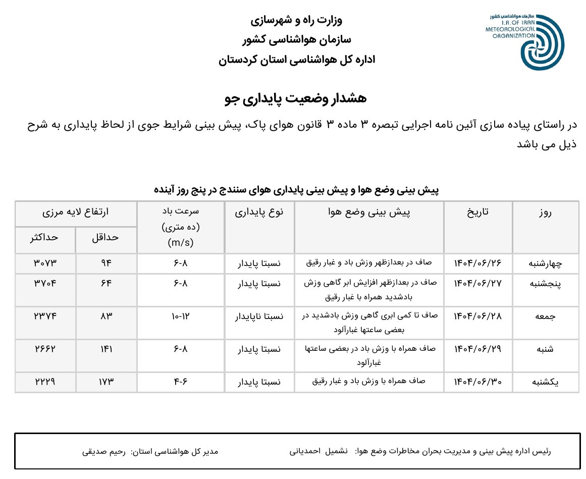 بولتن آلودگی استان کردستان؛ تاریخ صدور: چهارشنبه 26 شهریور ماه 1404