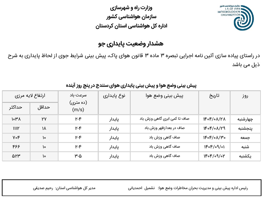 بولتن آلودگی استان کردستان؛ تاریخ صدور : چهارشنبه 28 آبان ماه 1404