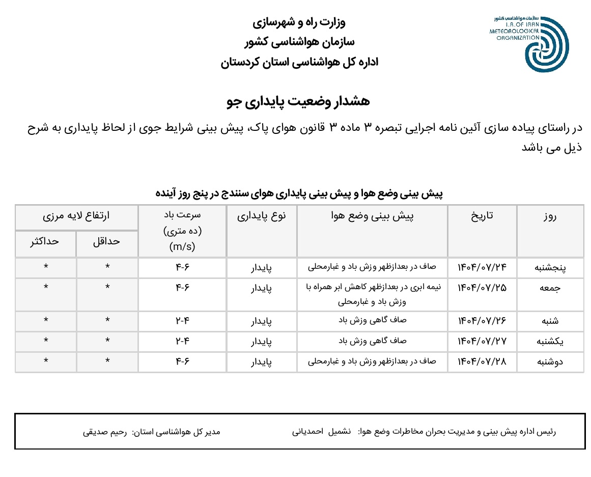 بولتن آلودگی استان کردستان؛ تاریخ صدور : پنحشنبه 24 مهر ماه 1404