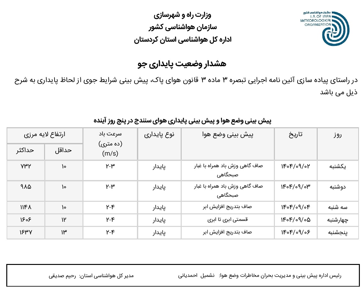 بولتن آلودگی استان کردستان؛ تاریخ صدور : یکشنبه 2 آذر ماه 1404