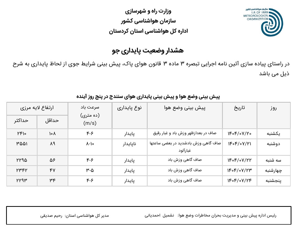بولتن آلودگی استان کردستان؛ تاریخ صدور : یکشنبه 20 مهر ماه 1404
