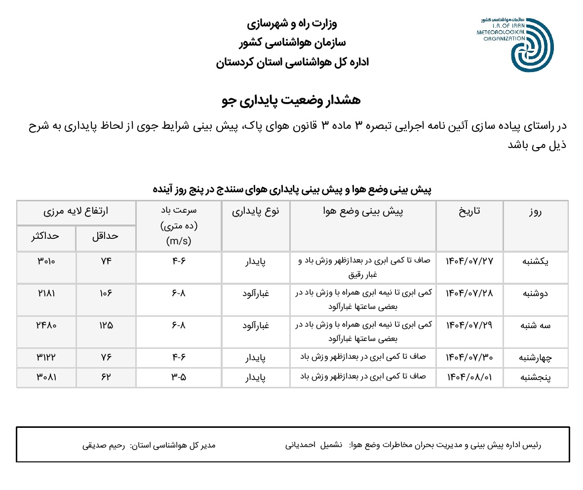 بولتن آلودگی استان کردستان؛ تاریخ صدور : یکشنبه 27 مهر ماه 1404