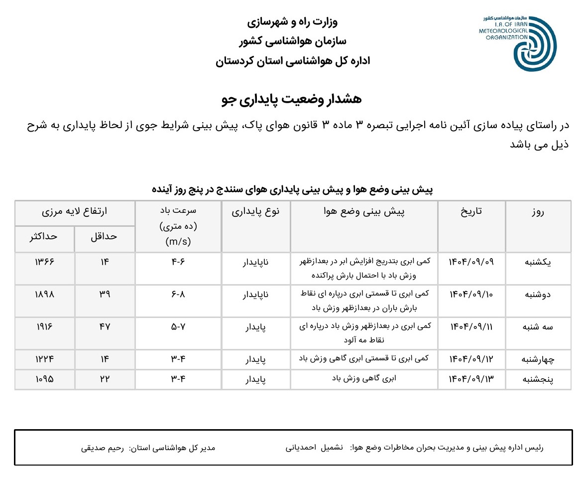 بولتن آلودگی استان کردستان؛ تاریخ صدور : یکشنبه 9 آذر ماه 1404