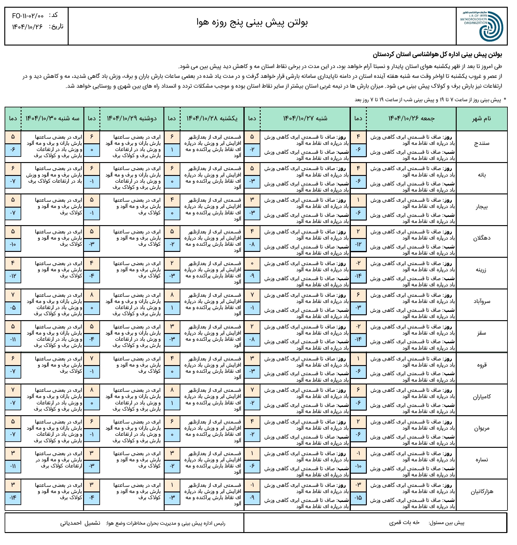 بولتن پیش بینی پنج روزه وضع هوای استان کردستان؛ تاریخ صدور: جمعه 26 دی ماه 1404