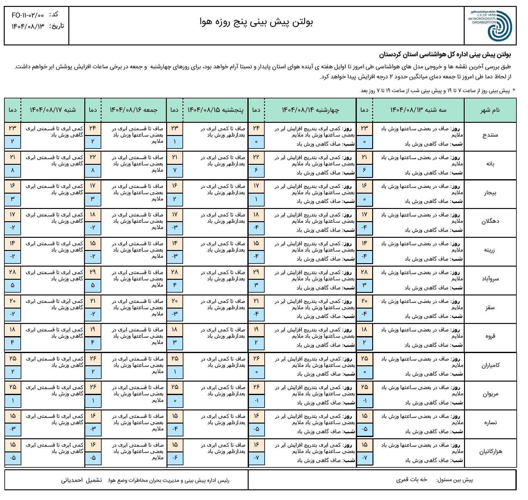 بولتن پیش بینی پنج روزه وضع هوای استان کردستان؛ تاریخ صدور: سه شنبه 13 آبان ماه 1404