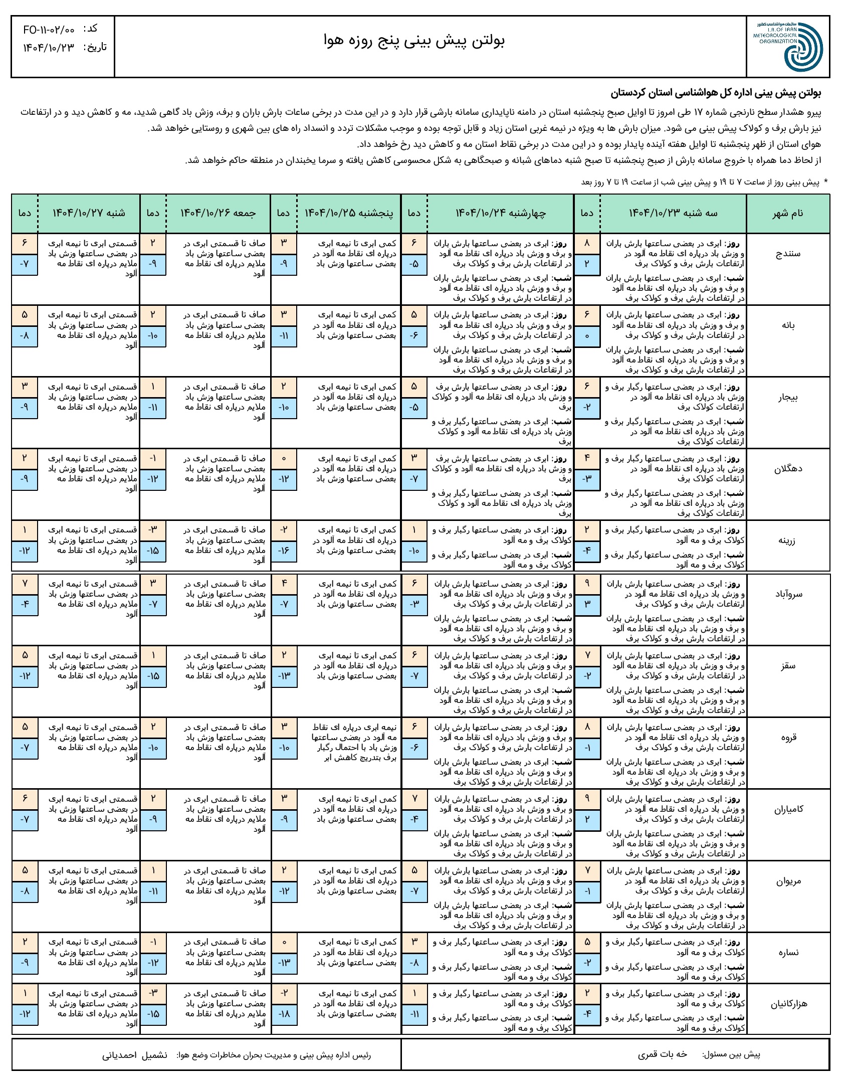 بولتن پیش بینی پنج روزه وضع هوای استان کردستان؛ تاریخ صدور: سه شنبه 23 دی ماه 1404