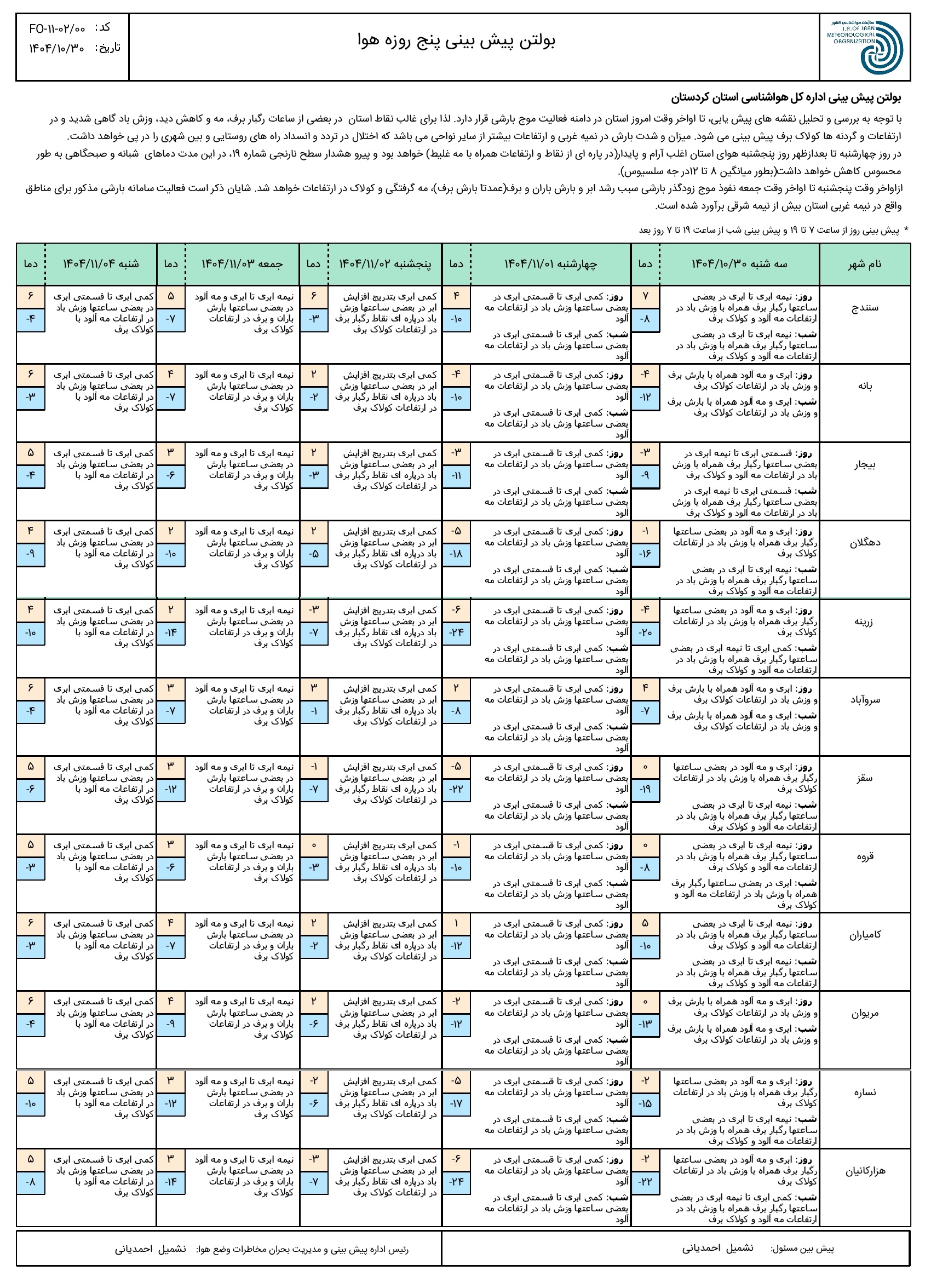 بولتن پیش بینی پنج روزه وضع هوای استان کردستان؛ تاریخ صدور: سه شنبه 30 دی ماه 1404