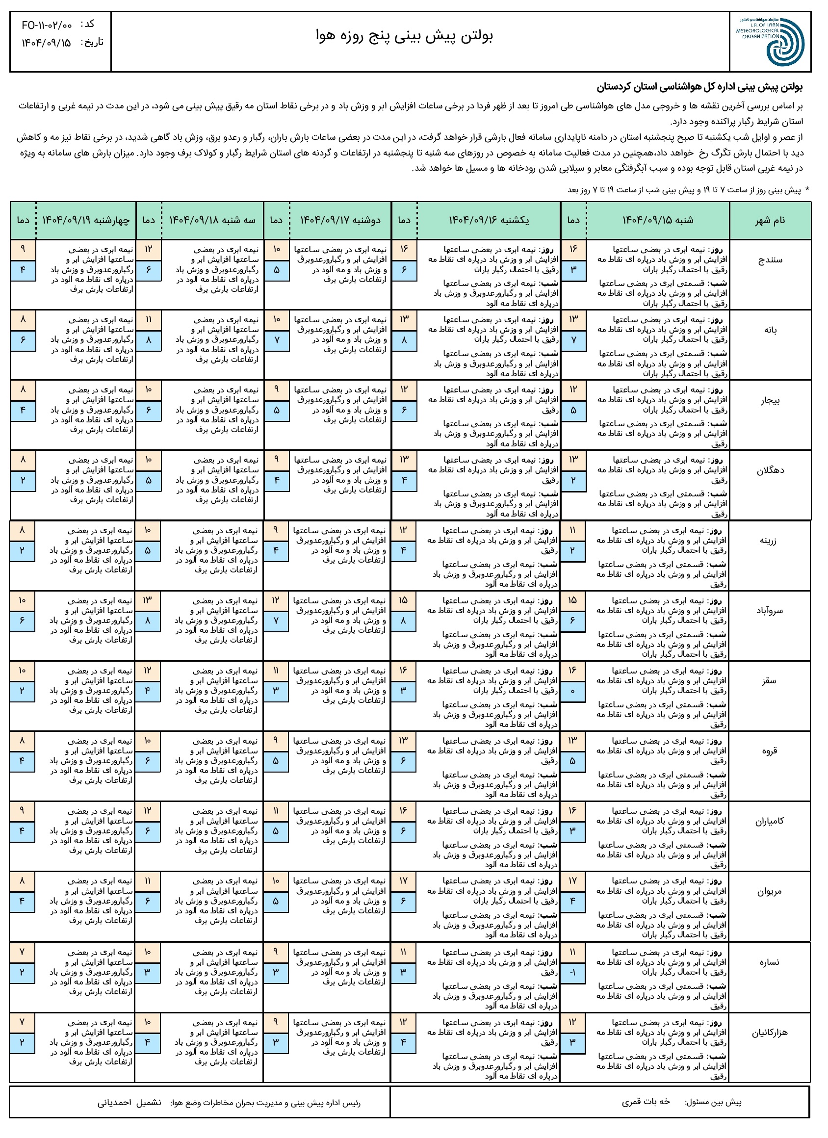 بولتن پیش بینی پنج روزه وضع هوای استان کردستان؛ تاریخ صدور: شنبه 15 آذر ماه 1404