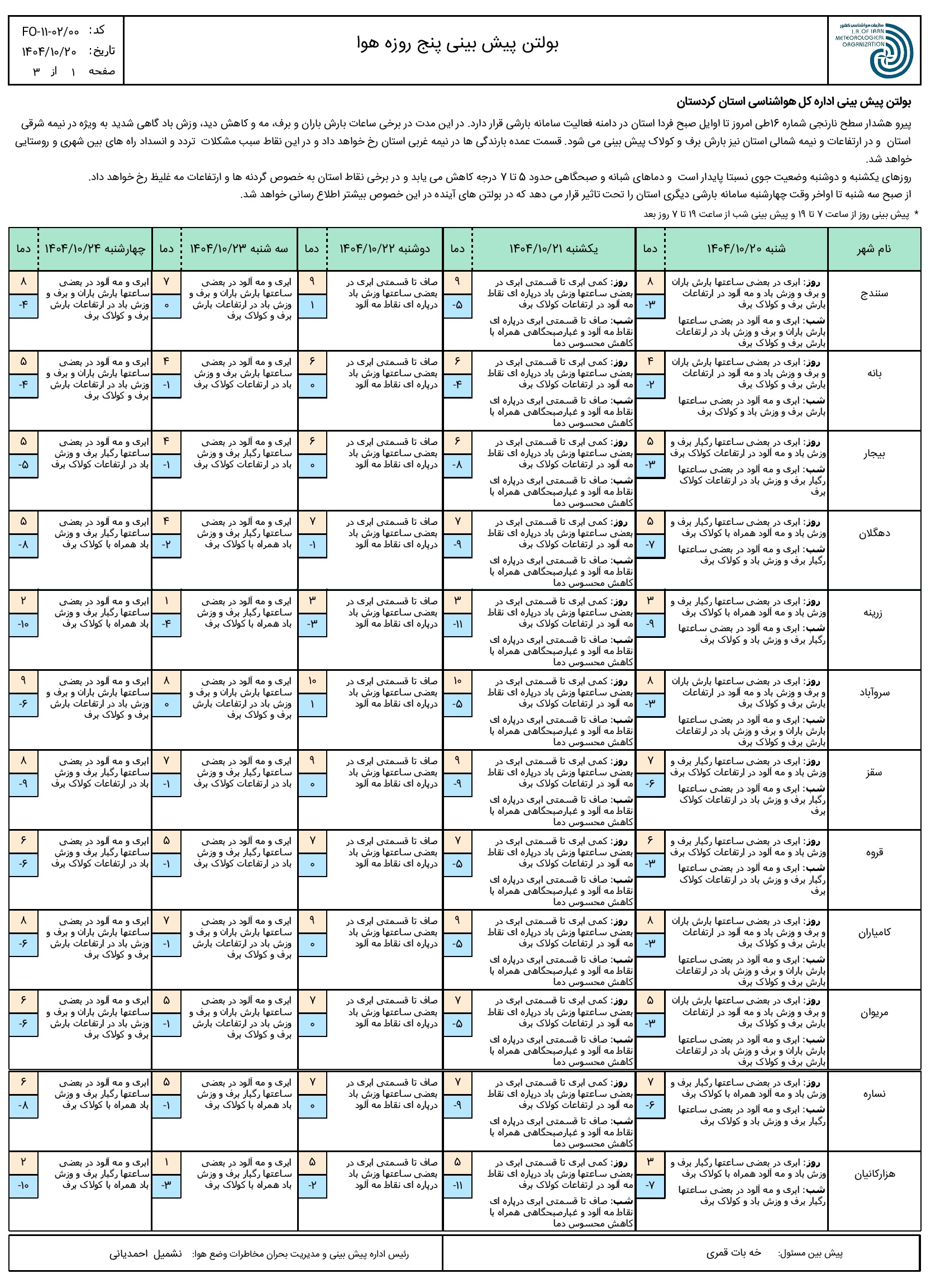 بولتن پیش بینی پنج روزه وضع هوای استان کردستان؛ تاریخ صدور: شنبه 20 دی ماه 1404