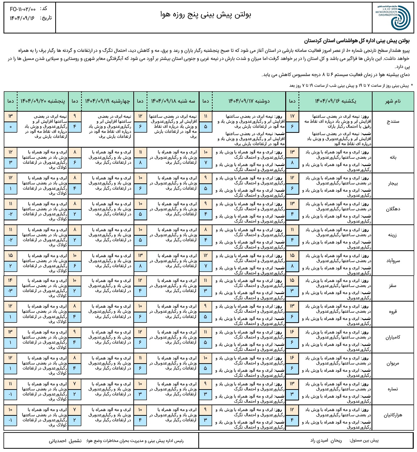 بولتن پیش بینی پنج روزه وضع هوای استان کردستان؛ تاریخ صدور: یکشنبه 16 آذر ماه 1404