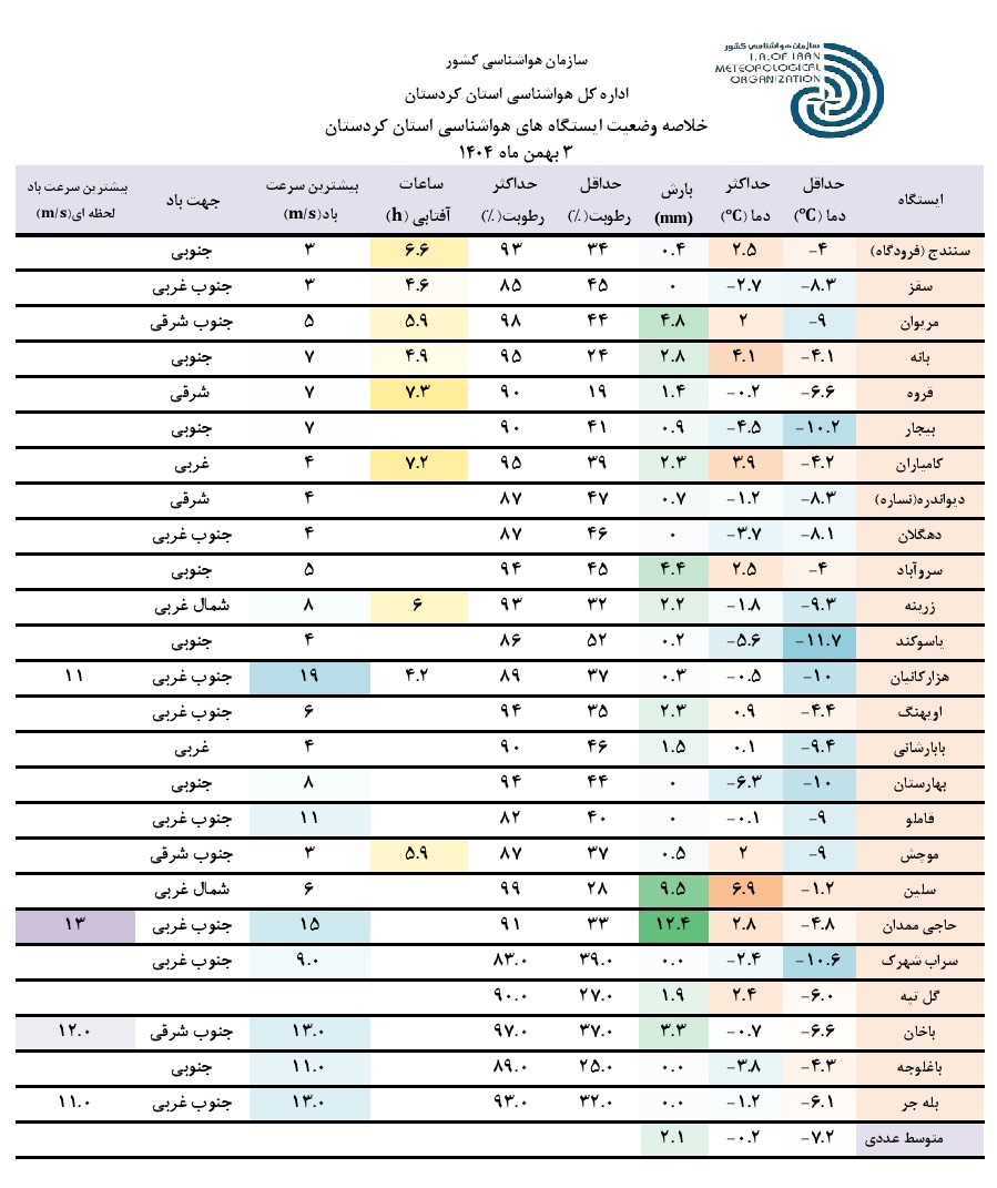 خلاصه وضعیت ایستگاه های هواشناسی استان کردستان در 24 ساعت گذشته؛ تاریخ تهیه: جمعه 3 بهمن ماه 1404