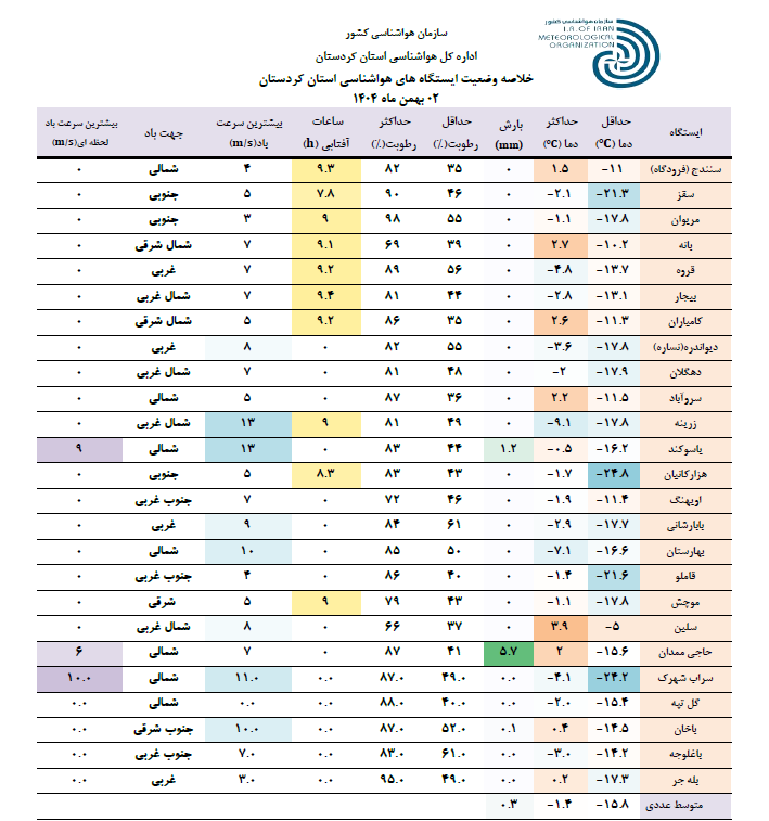 خلاصه وضعیت ایستگاه های هواشناسی استان کردستان در 24 ساعت گذشته؛ تاریخ تهیه: پنجشنبه 2 بهمن ماه 1404