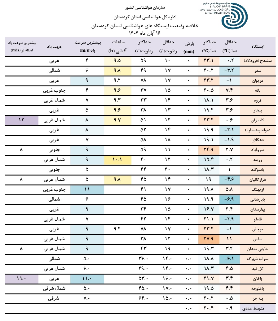 خلاصه وضعیت ایستگاه های هواشناسی استان کردستان در 24 ساعت گذشته؛ تاریخ صدور: جمعه 16 آبان ماه 1404