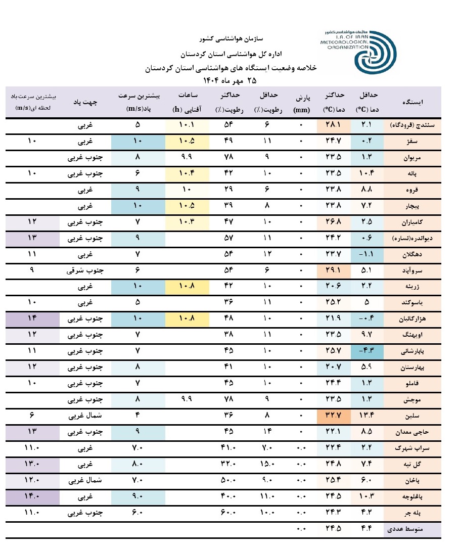 خلاصه وضعیت ایستگاه های هواشناسی استان کردستان در 24 ساعت گذشته؛ تاریخ صدور: جمعه 25 مهر ماه 1404