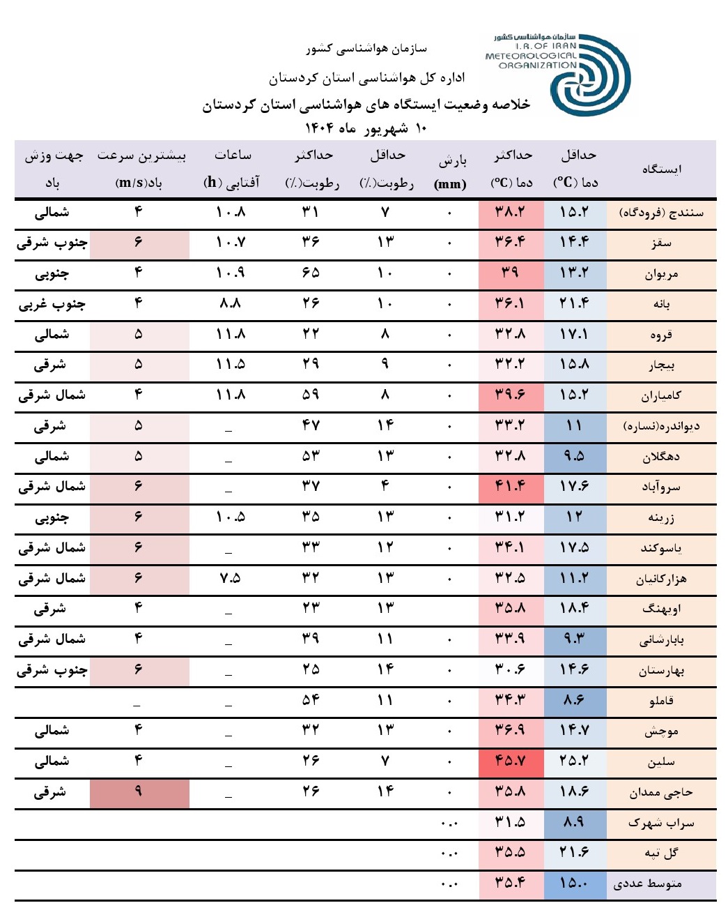 خلاصه وضعیت ایستگاه های هواشناسی استان کردستان در 24 ساعت گذشته؛ تاریخ صدور:دوشنبه 10 شهریور ماه 1404