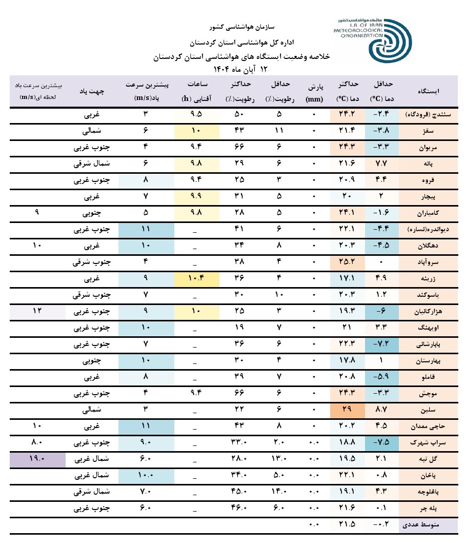 خلاصه وضعیت ایستگاه های هواشناسی استان کردستان در 24 ساعت گذشته؛ تاریخ صدور: دوشنبه 12 آبان ماه 1404