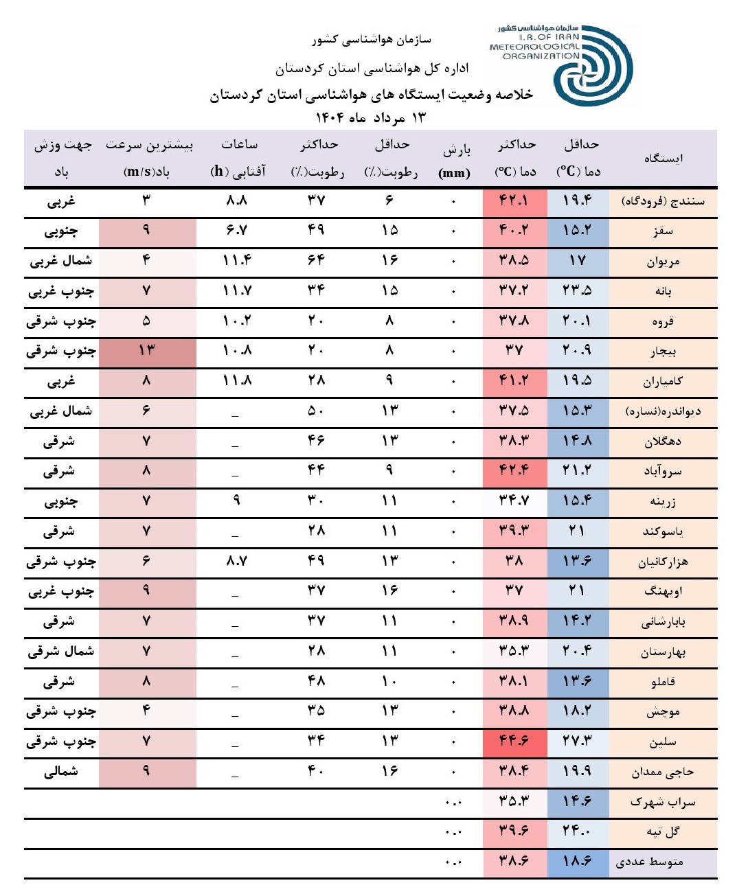 خلاصه وضعیت ایستگاه های هواشناسی استان کردستان در 24 ساعت گذشته؛ تاریخ صدور: دوشنبه 13 مرداد ماه 1404