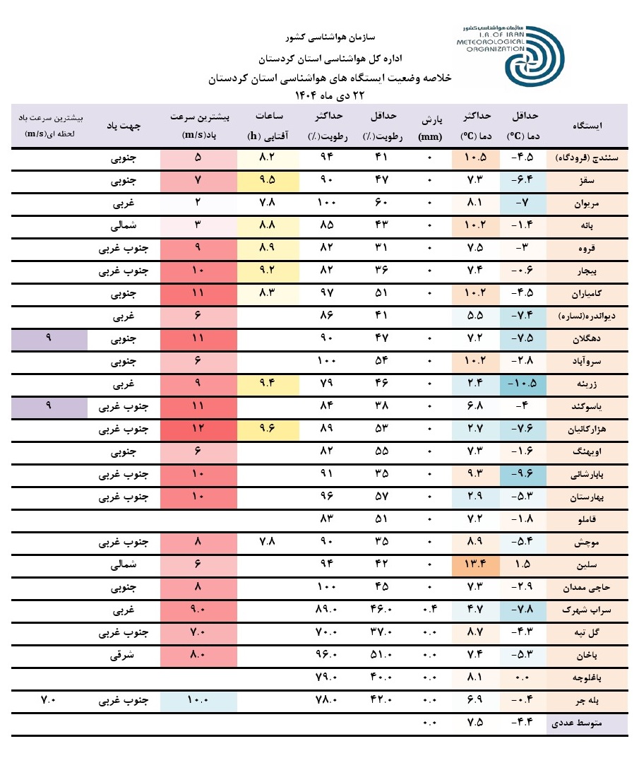 خلاصه وضعیت ایستگاه های هواشناسی استان کردستان در 24 ساعت گذشته؛ تاریخ صدور: دوشنبه 22 دی ماه 1404