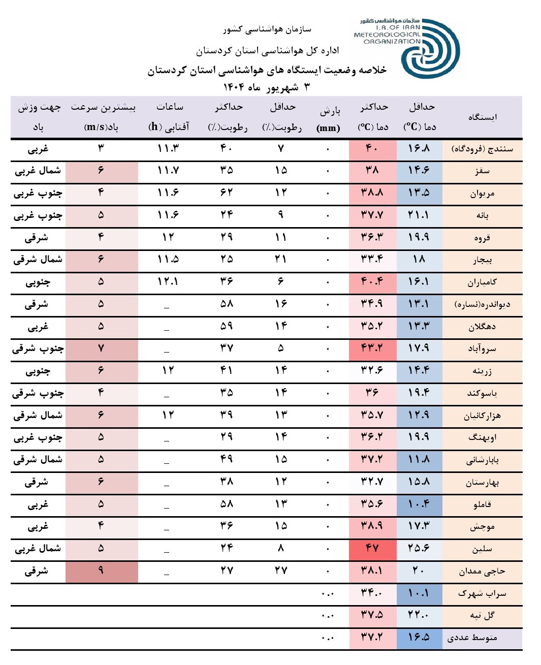 خلاصه وضعیت ایستگاه های هواشناسی استان کردستان در 24 ساعت گذشته؛ تاریخ صدور: دوشنبه 3 شهریور ماه 1404