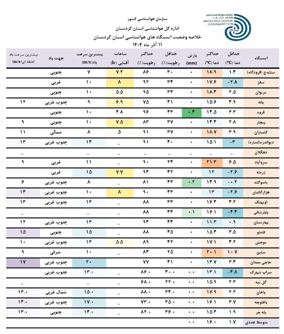 خلاصه وضعیت ایستگاه های هواشناسی استان کردستان در 24 ساعت گذشته؛ تاریخ صدور: سه شنبه 11 آذر ماه 1404