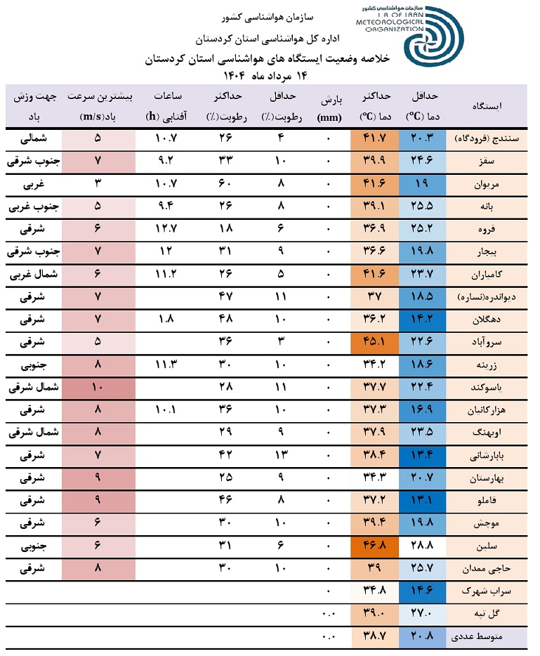 خلاصه وضعیت ایستگاه های هواشناسی استان کردستان در 24 ساعت گذشته؛ تاریخ صدور: سه شنبه 14 مرداد ماه 1404
