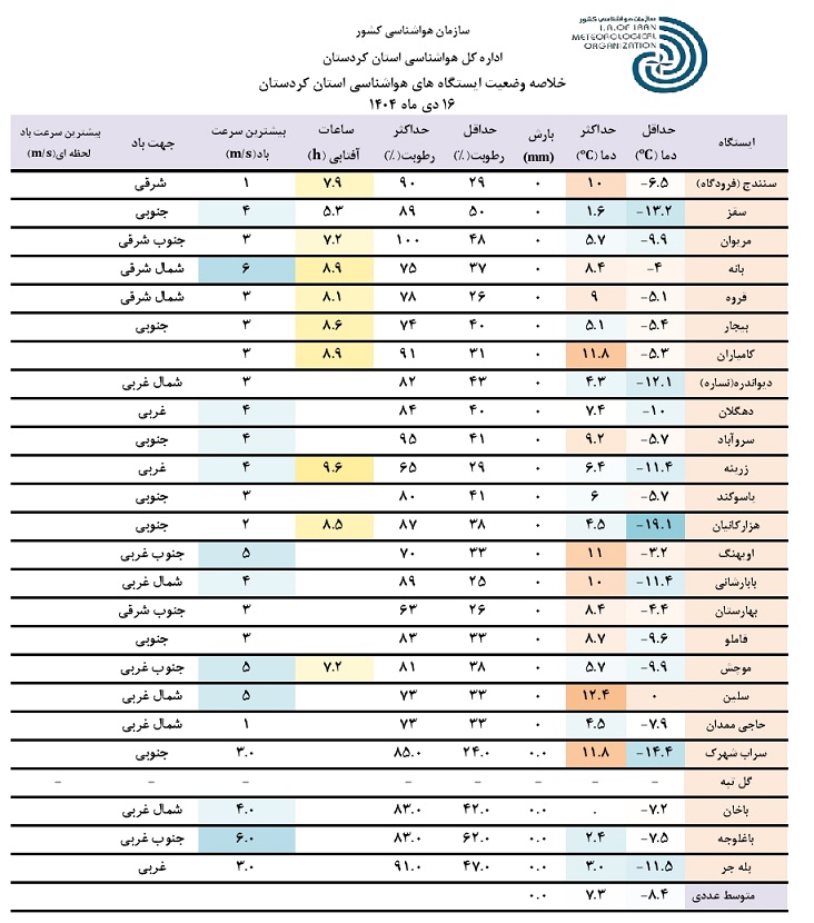 خلاصه وضعیت ایستگاه های هواشناسی استان کردستان در 24 ساعت گذشته؛ تاریخ صدور: سه شنبه 16 دی ماه 1404
